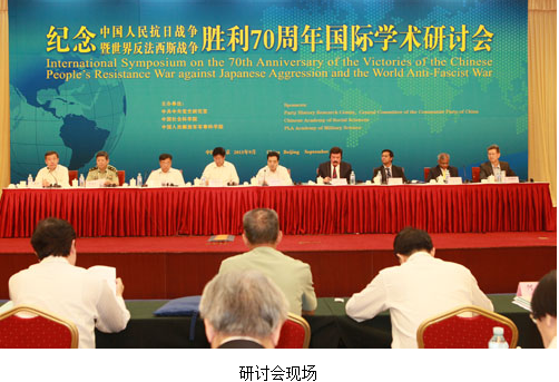 9月2日,由中共中央党史研究室、中国社会科学院、中国人民解放军军事科学院联合主办的“纪念中国人民抗日战争暨世界反法西斯战争胜利70周年国际学术研讨会”在北京举行。这次学术研讨会以“铭记历史、缅怀先烈、珍爱和平、开创未来”为主题,围绕中国人民抗日战争的伟大意义、中国人民抗日战争在世界反法西斯战争中的重要地位、中国共产党在抗日战争中的中流砥柱作用、中国国民党及其领导的正面战场的地位和作用、日本军国主义的侵华罪行及给中华民族带来的沉重灾难等问题进行了深入研讨。