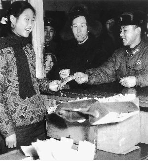 雷锋一个月只有6元津贴,平时舍不得乱花一分钱。1960年初秋,他得知部队驻地望花区和平人民公社成立,便慷慨地从银行取出自己的200元积蓄,准备送给公社。季增抢拍了这个场景,但洗照片时发现,刚好赶上胶卷的最后一张,是个半拉照,底片上只有营业员,没有雷锋。作者后来补拍了这张照片。摄影/季增(均选自《雷锋照片大全》)