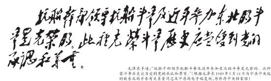 毛泽东手迹:“抗联干部领导抗联斗争及近年参加东北的斗争是光荣的。此种光荣斗争历史应当受到党的承认和尊重?!保ǜ菝蠖?949年5月14日为中共中央起草的致东北局并告有关负责同志及中原局电手稿复制,原件存中央档案馆)