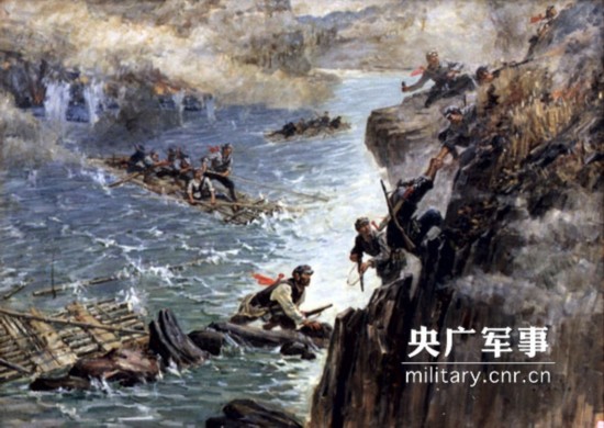 这时,红军的竹筏乘隙加速前进,筏头激溅起一簇簇雪白的浪花。竹筏上的同志与崖底下的人组成了交叉火力,像把钳子紧紧地咬住了敌人。敌人在轻机关枪的射击声和手榴弹的爆炸声中,死的死,伤的伤。敌人的气焰被压下去了,纷纷向后逃窜。