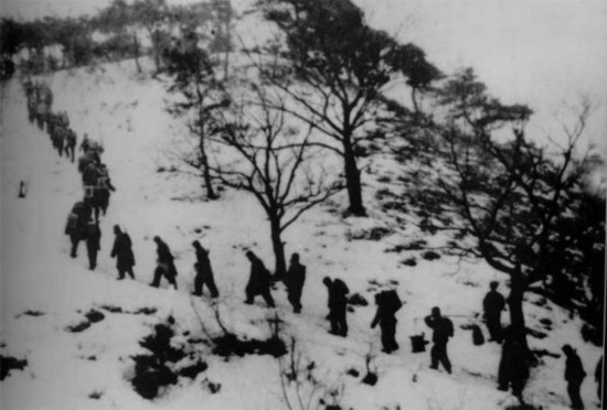 志愿军第9兵团在皑皑白雪中向长津湖地区挺进。1950年11月,中美两支王牌军在此展开了一场激战。美军包括海军陆战队第1师(简称陆战一师)和第3、第7步兵师,以及韩国第1军团,约10万人;攻击这支部队的是志愿军第9兵团,由20军、26军和27军组成,近15万人。在零下30-40度的严寒中苦斗20天之后,美军残部在7艘航空母舰的掩护下,利用海路脱离战场,这也意味着“联合国军”全部被逐出朝鲜东北部。
