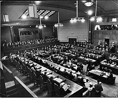 1945年11月21日戈林(中)在纽伦堡国际军事法庭上接受审判。资料照片