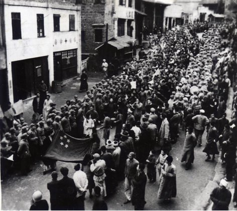 1949年12月8日,群众热烈欢迎中国人民解放军进入万县城区(杨家街口)。