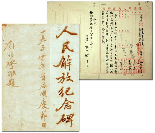1949年12月1日《大公报》报道重庆解放。 1950年国庆节,刘伯承题写的“人民解放纪念碑”手稿。