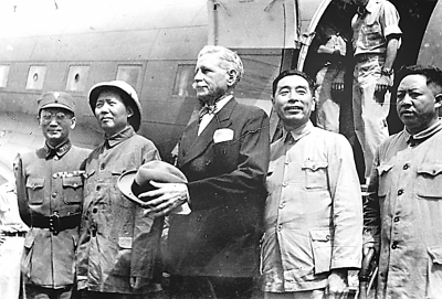 图为1945年8月28日,为争取国内和平,毛泽东和周恩来、王若飞在赫尔利、张治中陪同下离开延安赴重庆谈判。新华社发