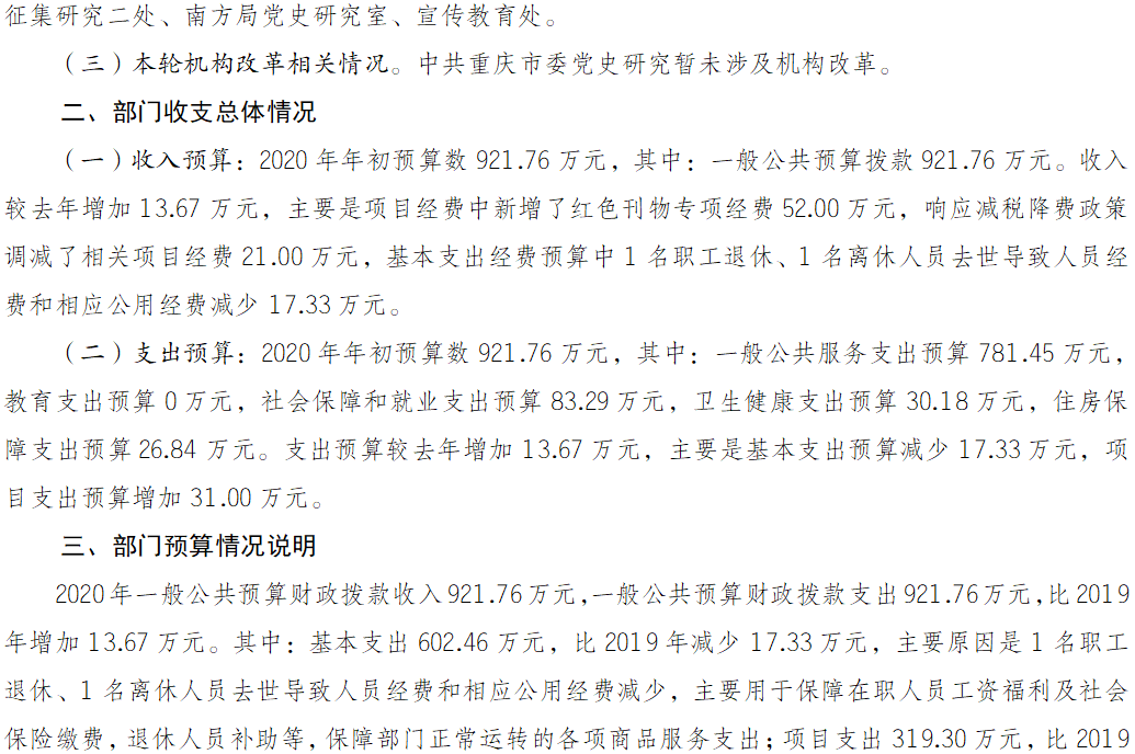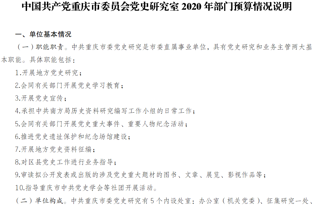 中国共产党重庆市委员会党史研究室2020年部门预算公开