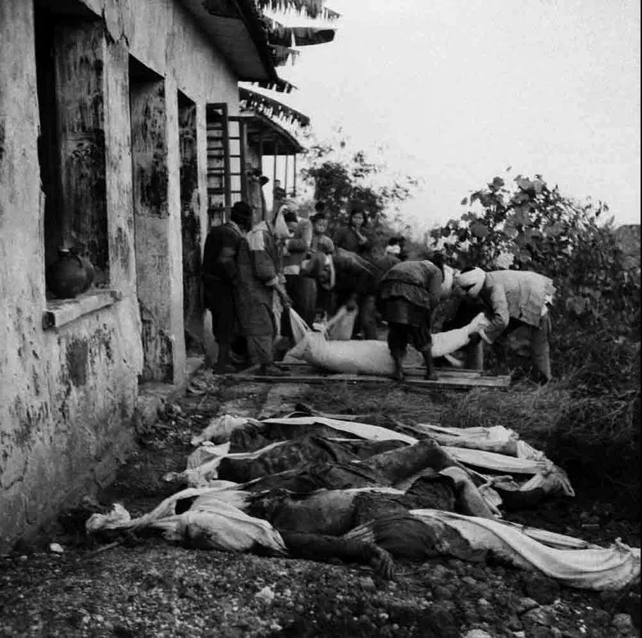 解放后,政府组织人民群众包扎在白公馆监狱附近被屠杀的烈士遗体