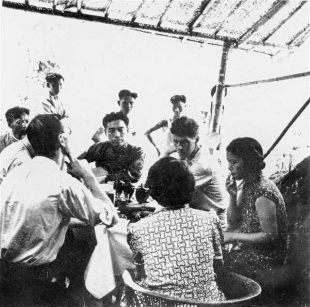 1940年夏,周恩来在红岩村防空洞外的席棚下接待外国记者。(红岩联线供图)